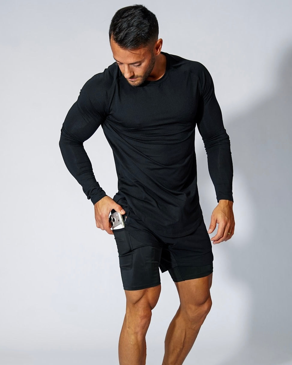 Shortsen har fodrade telefonfickor för att hålla telefonen på sidorna, en bakficka med dragkedja för säker förvaring, en ögla för en träningshandduk och reflekterande detaljer för god synlighet på natten. Dragband kan vara på antingen insidan eller utsidan av midjebandet genom en konstruerad och innovativ lösning.